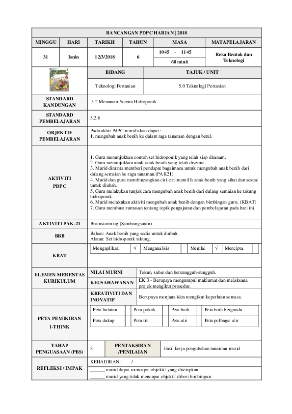 Reka Bentuk dan Teknologi RBT. Hidroponik adalah gabungan dua perkataan Greek iaitu. Tanaman hidroponik Tahun 6 Hidroponik merupakan satu kaedah penanaman tumbuh-tumbuhan tanpa tanah.